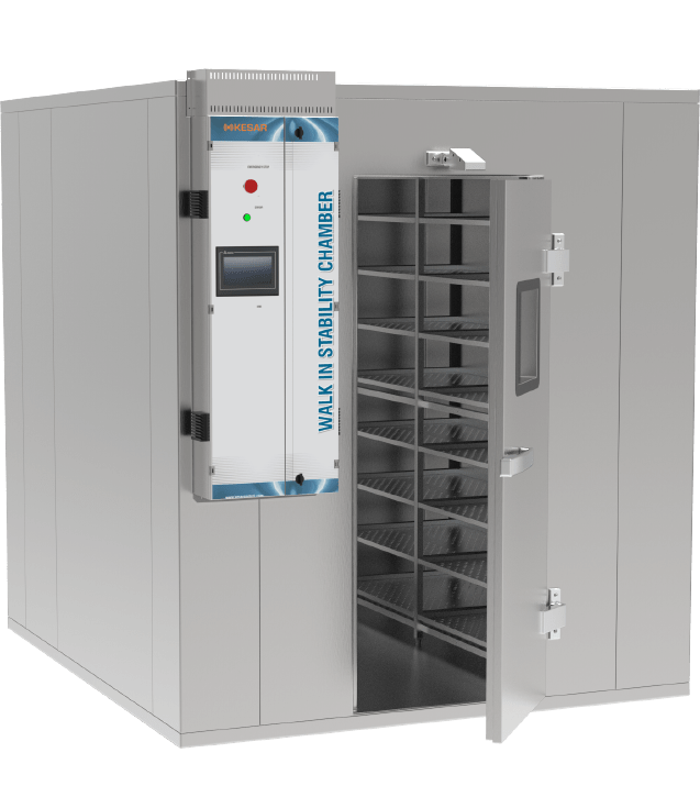 A Walk-in Chamber is a Stability chamber that is large enough for a scientist to physically walk into and perform their tests. Walk-in chamber types are prevalent in more prominent pharmaceutical companies where large batches of drugs are to be tested at the same time. Other than that, a walk-in chamber works in the same way as a normal reach-in stability chamber by managing the parameters of temperature and relative humidity within the walk-in chamber to perform tests.